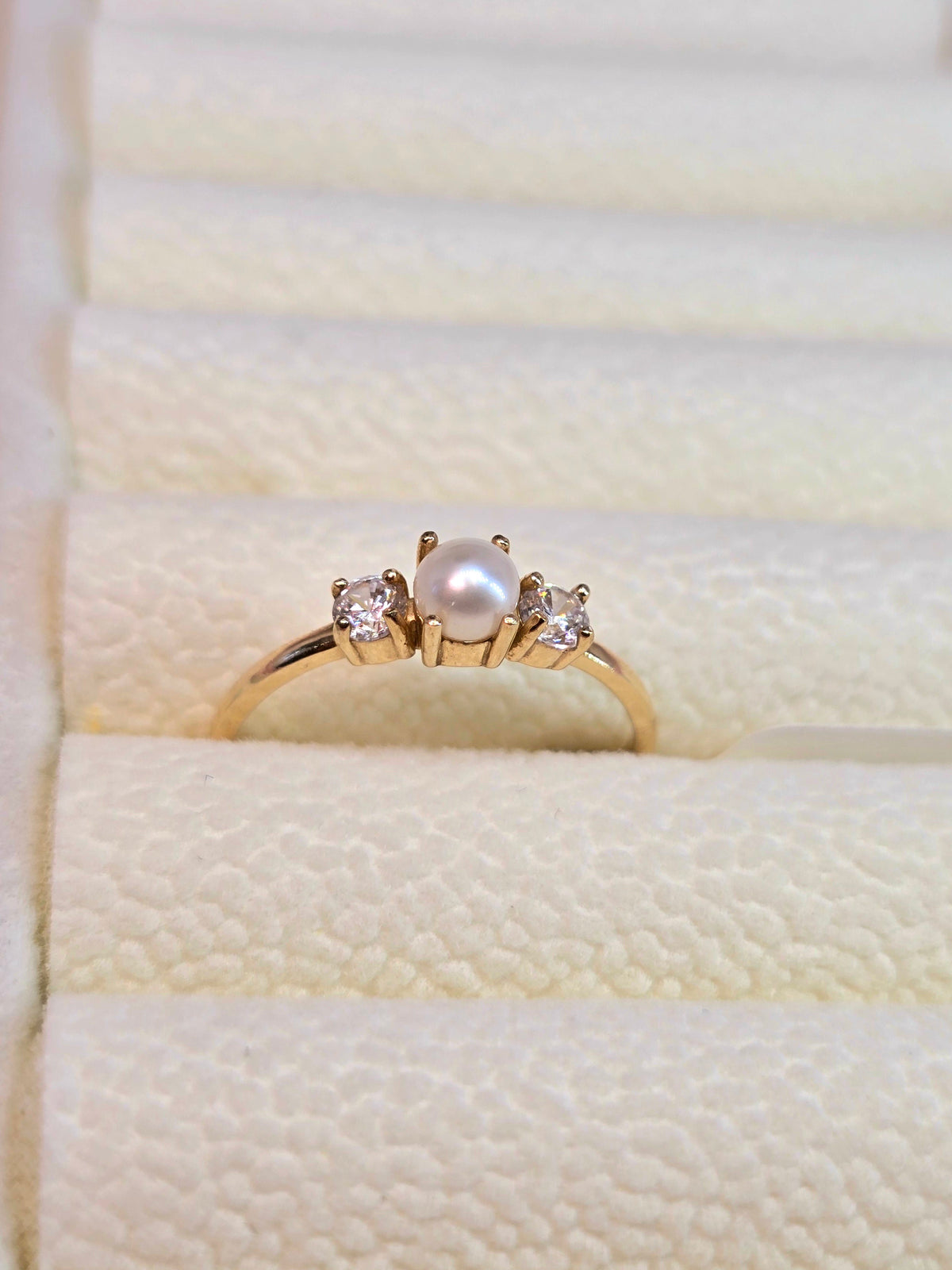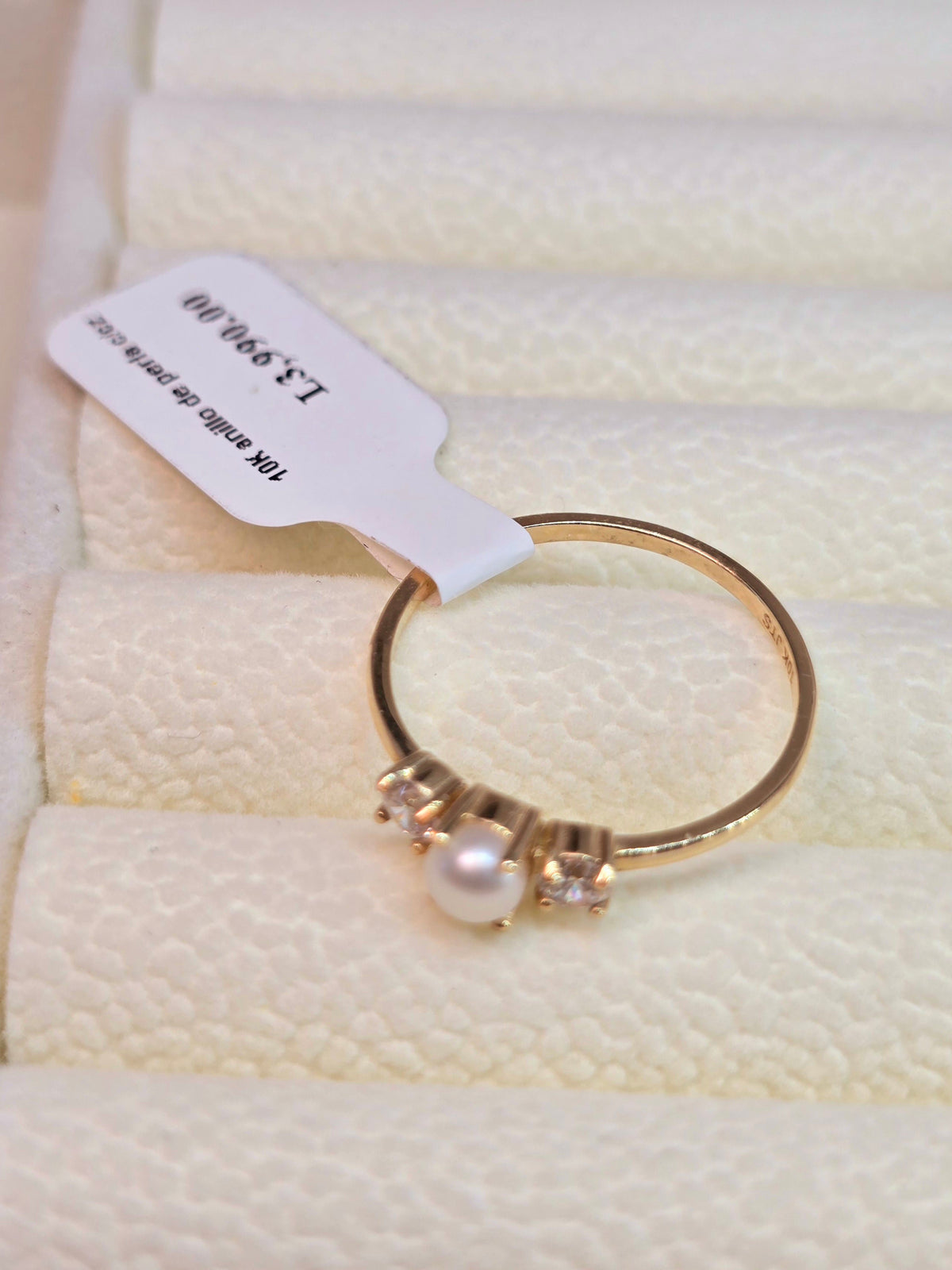 Anillo de oro 10k con una perla natural central rodeada de circones