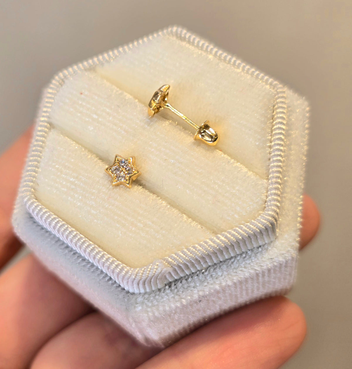 Aretes de oro 14k con tapon enroscable y formas, ideales para piercings y para niñas! todos te encantaran!