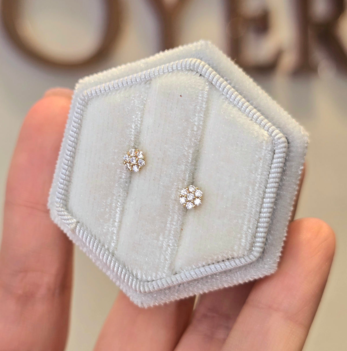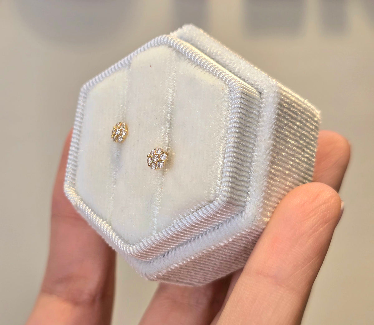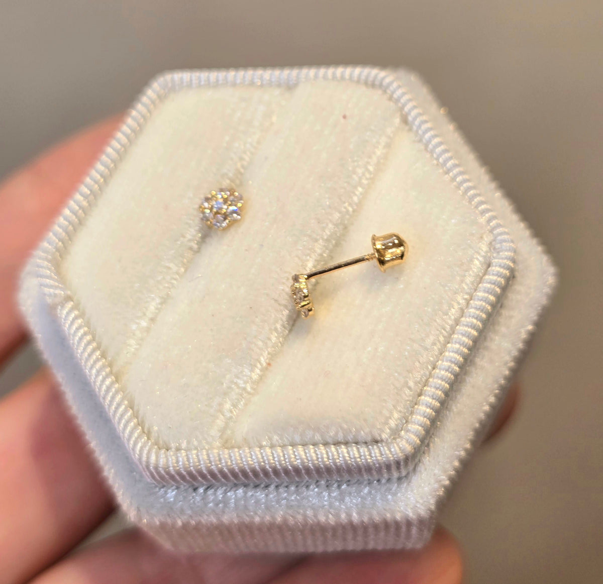 Clasico y hermoso mini stud en forma de platito de circones en oro 14k