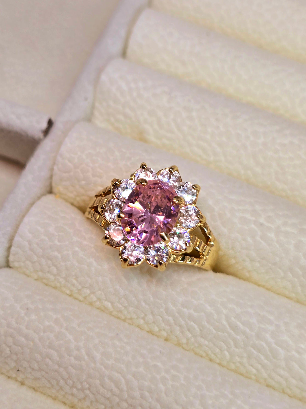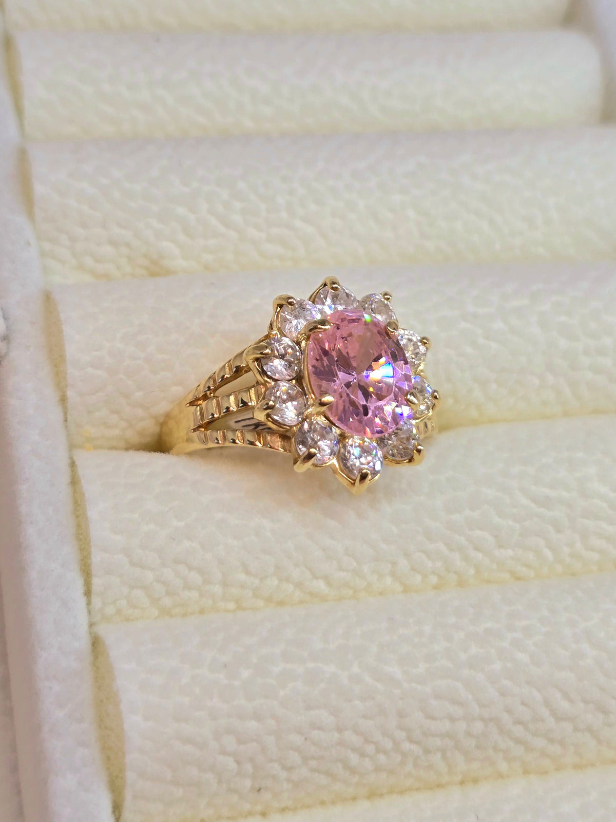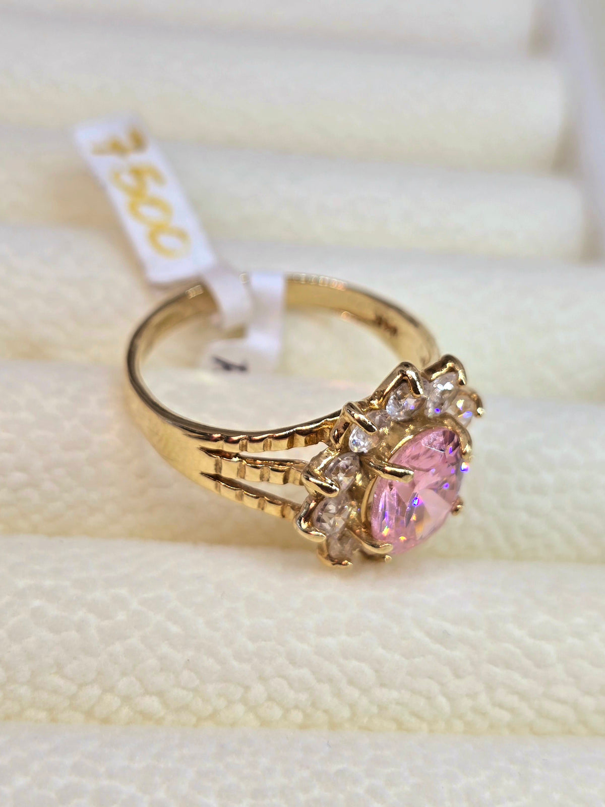Anillo en oro 14k con piedra circonia rosada central y transparentes